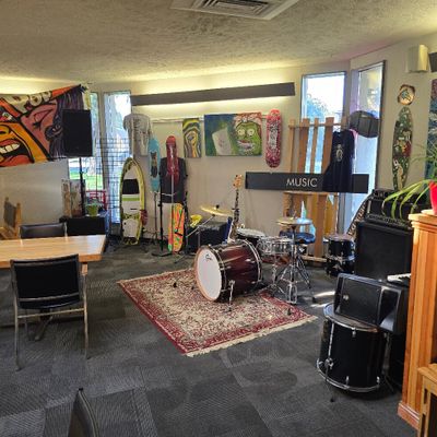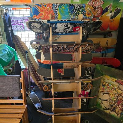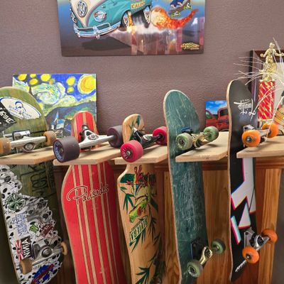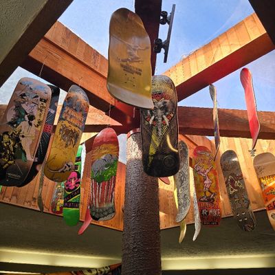 The atmosphere is lively and personal, decorated with skateboards and paintings that give it a unique character. Upbeat music fills the air, making the space feel energetic and welcoming.ambiance_potoo