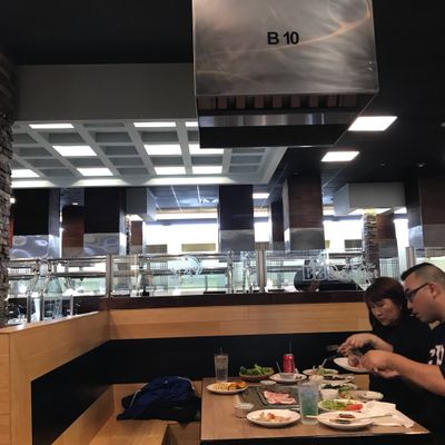 Korean BBQ buffet with a sizeable selection of meats and sides, offering a unique DIY grilling experience in a spacious setting.