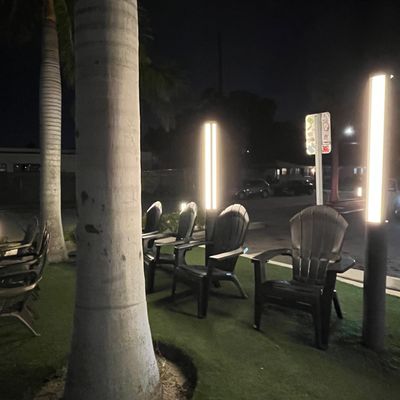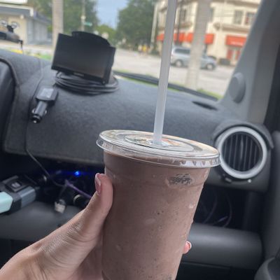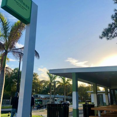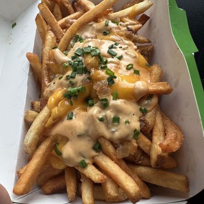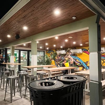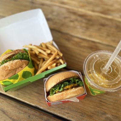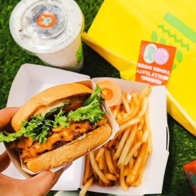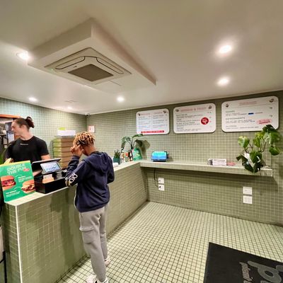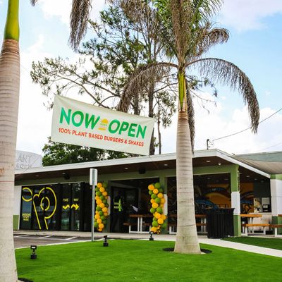 Vegan fast-food restaurant with outdoor seating offering tasty burgers, fries, and shakes in a modern setting.
