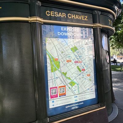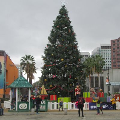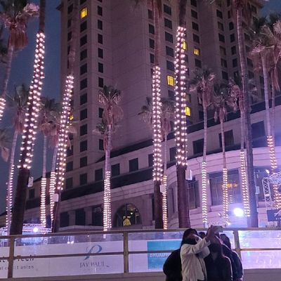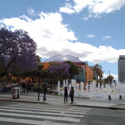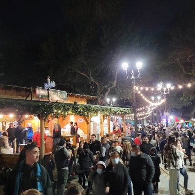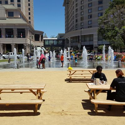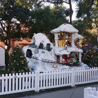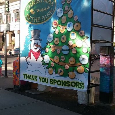 Vibrant urban green space that offers a refreshing splash pad and fountain area, surrounded by tables and shaded seating. The park features mature trees, providing ample shade, and hosts various community events throughout the year, most notably the popular Christmas in the Park festivities.