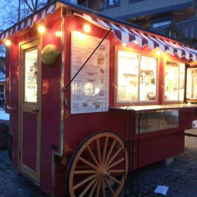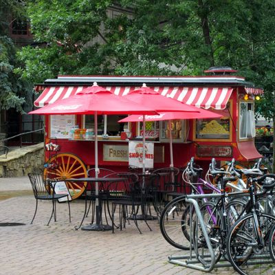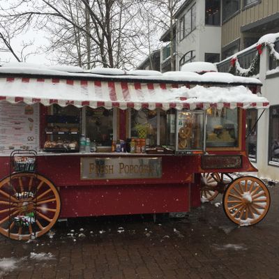 Fast-food stand in Vail Village offering hot dogs, popcorn, pretzels, and breakfast burritos, known for its convenient location and friendly service.