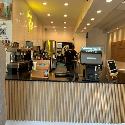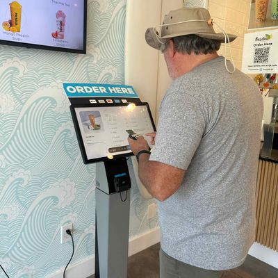 Boba tea shop with a self-ordering kiosk offering refreshing drinks in a casual setting.