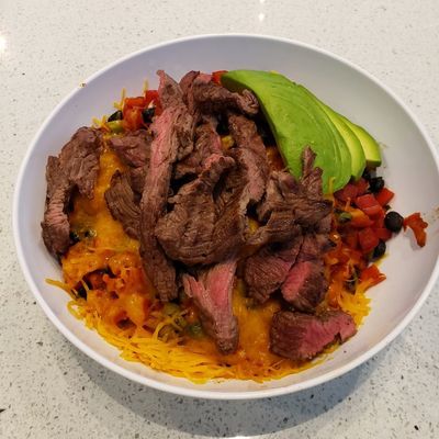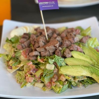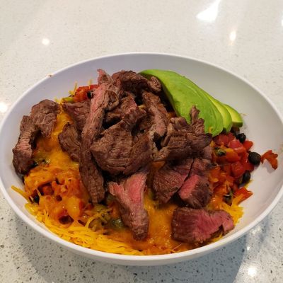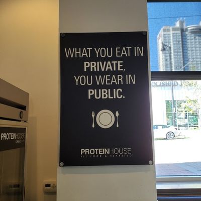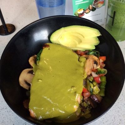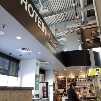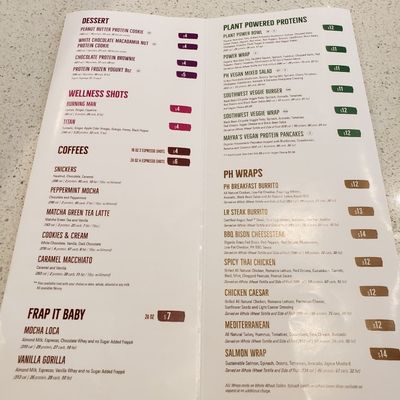 Healthy cafe offering bowls, wraps, and smoothies with bison and salmon options, in a modern setting, popular for its healthful menu.