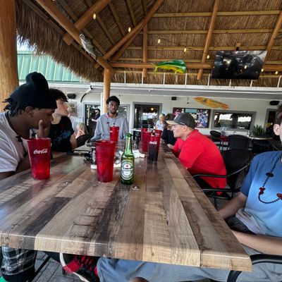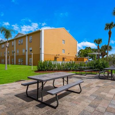 The atmosphere is functional and straightforward, centered around a central outdoor pool area. The property serves as a practical home base for travelers looking to access nearby beaches and state parks.ambiance_potoo