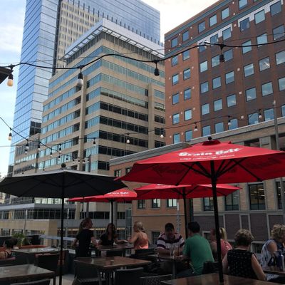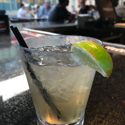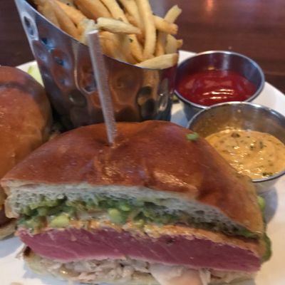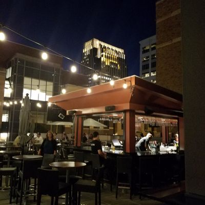 Upscale pub and restaurant with a rooftop patio offering American fare, including sushi and tacos, in a lively setting.