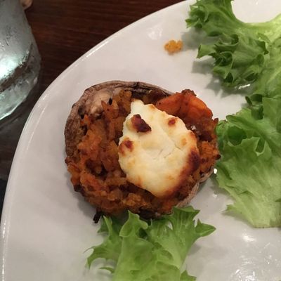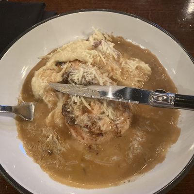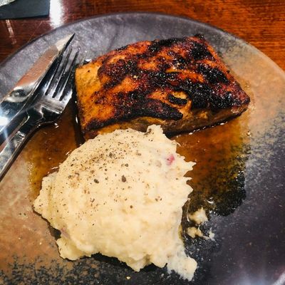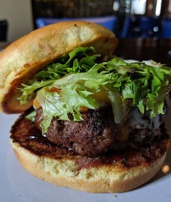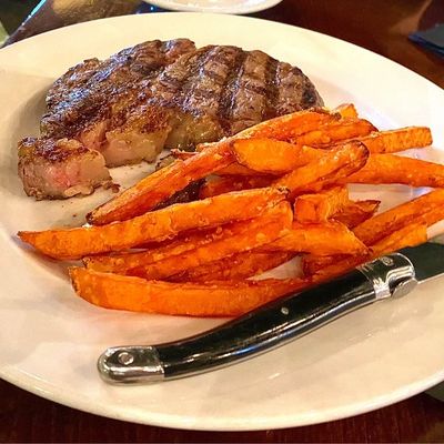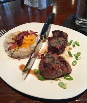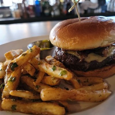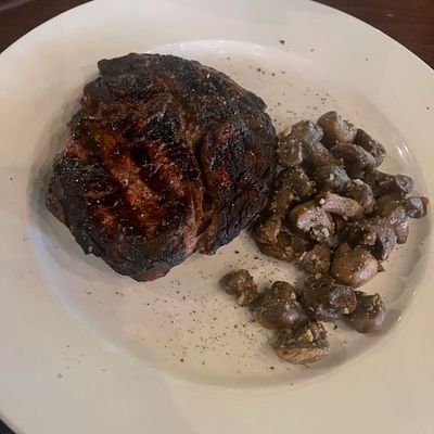 The menu features various steak preparations, including filet mignon and prime rib. The kitchen also offers specialized cheeseburger options.food_potoo