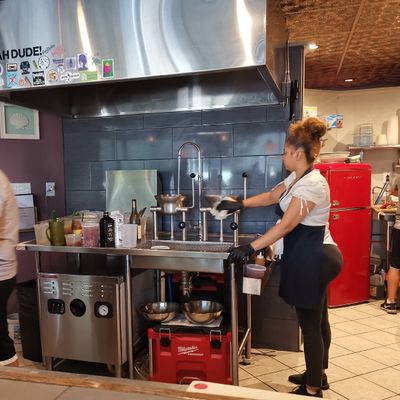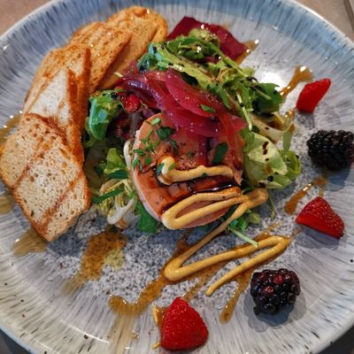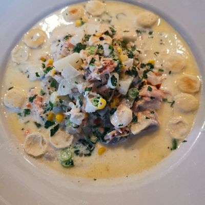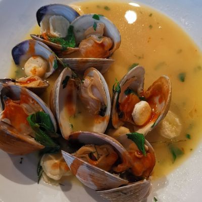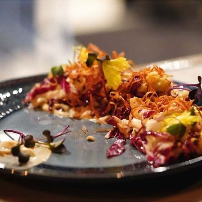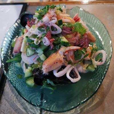 Small, seafood-focused restaurant with a unique boomerang-shaped counter where diners watch the chef prepare dishes in an open kitchen; known for its fresh, shareable plates and lively atmosphere.