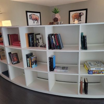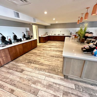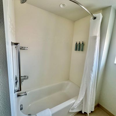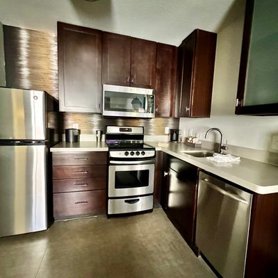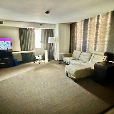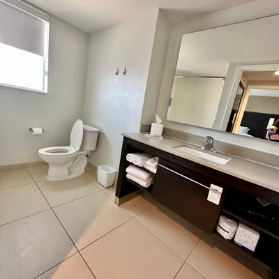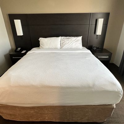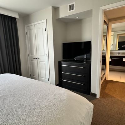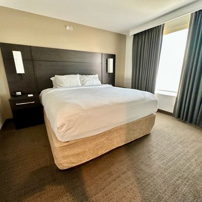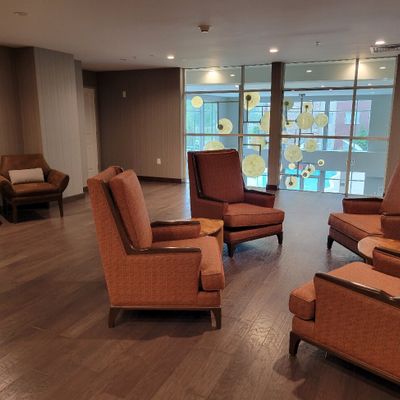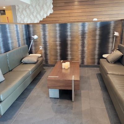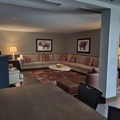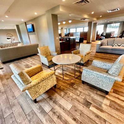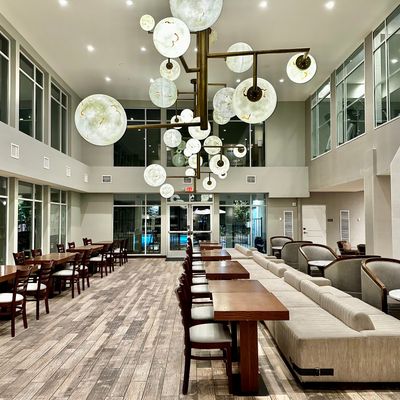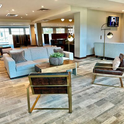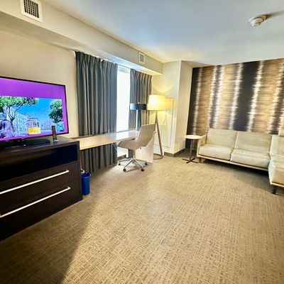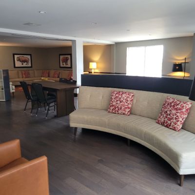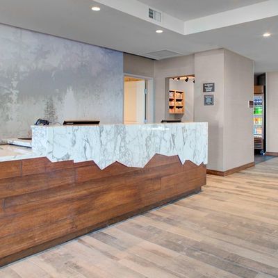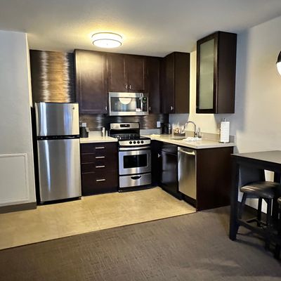 Extended-stay hotel offering spacious suites with full kitchens. It features a large, modern lobby with seating areas and a bar, and is conveniently located within walking distance of various shops and restaurants.