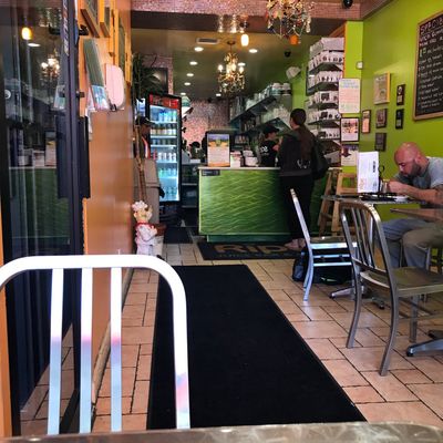 Small, healthy eatery offering wraps, salads, and smoothies in a bustling neighborhood setting, known for fresh ingredients and generous portions.