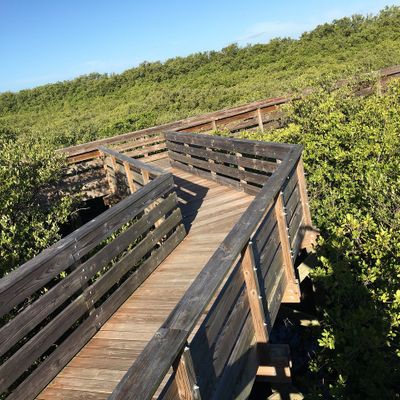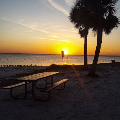 Serene beach park offering a peaceful escape with white sand and shallow waters. It features amenities such as pavilions, grills, clean restrooms, and outdoor showers, alongside a boardwalk trail with viewing opportunities for local wildlife.