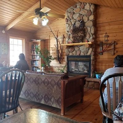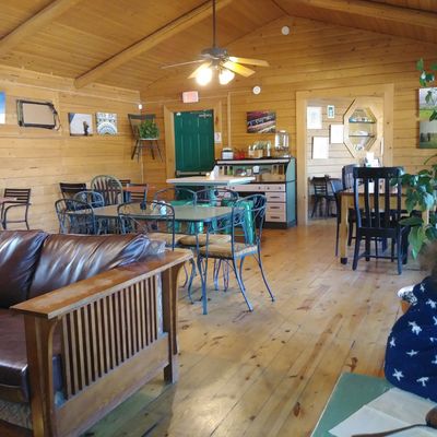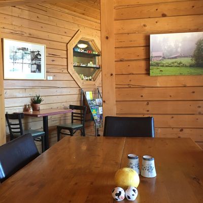 The interior features a rustic ambiance that evokes the feeling of a mountain lodge in the Rockies or Cascades. It is a cozy, inviting space perfect for a post-hike stop.ambiance_potoo