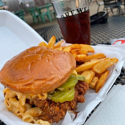 Family-friendly outdoor beer garden with rotating food trucks offering diverse cuisines like burgers, tacos, pizza, and crawfish, featuring a relaxed atmosphere and ample space.