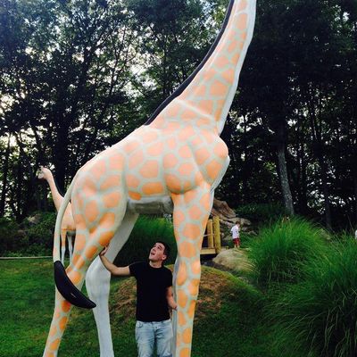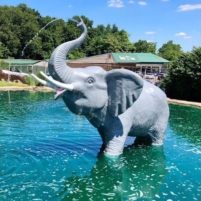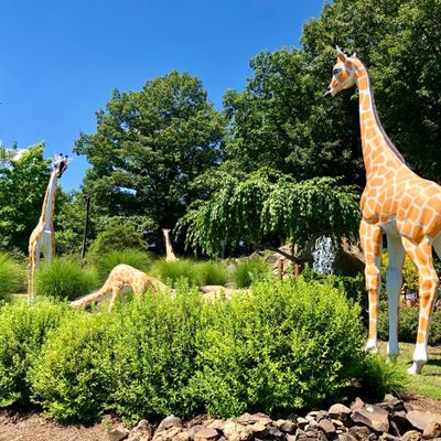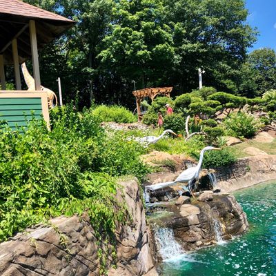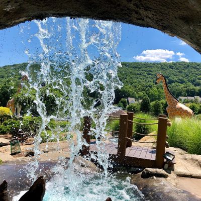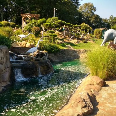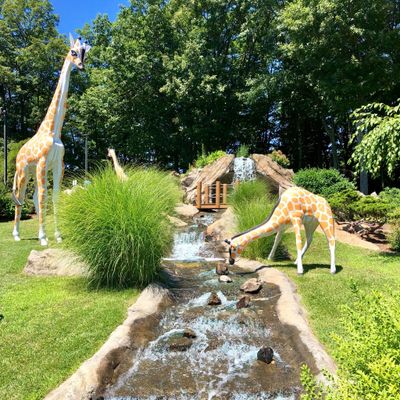 Well-maintained miniature golf course featuring a safari theme with animal statues and natural obstacles. The course winds up and down a hillside, incorporating features like a waterfall and varying levels.