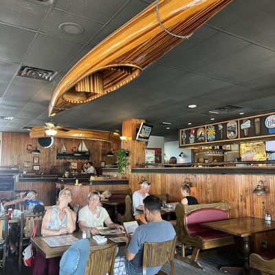 Lake-view American bar and grill with a varied menu, including seafood and burgers, offering both indoor and outdoor seating.