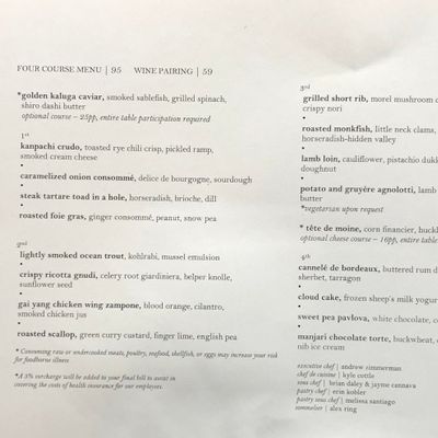 The menu features a refined selection of American cuisine, including seasonal entrees and specialized tasting menus. The wine pairings are specifically designed to complement the multi-course experience.food_potoo