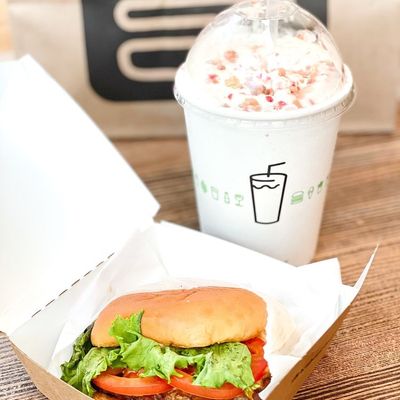 Chain serving elevated American fast food, including burgers and shakes, in a bustling location near Central Park.