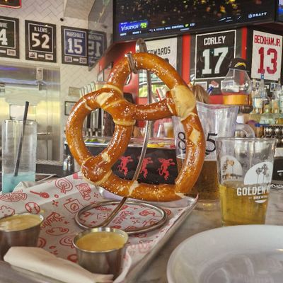 Sports bar in a shopping mall offering American bar food, including pizza and burgers, with a full bar and a sometimes inconsistent service experience.