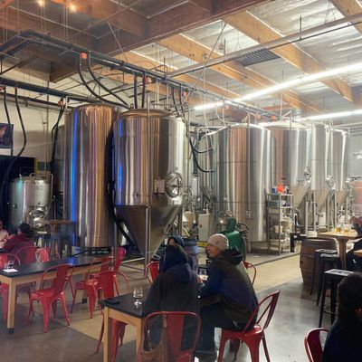 The industrial hum of the brewery floor permeates the taproom, a cavernous space where concrete and exposed piping meet long communal tables. It's a no-frills spot, designed for serious beer drinkers to gather amidst the brewing process.ambiance