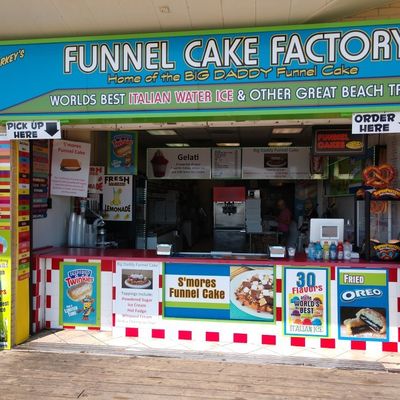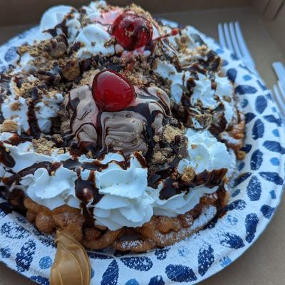 Boardwalk sweets shop offering giant, customizable funnel cakes and other treats like shaved ice and gelato.
