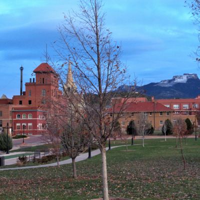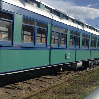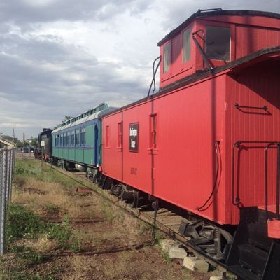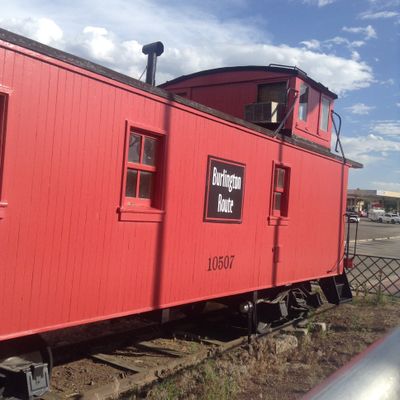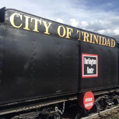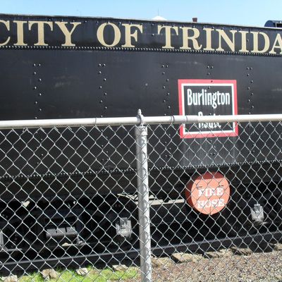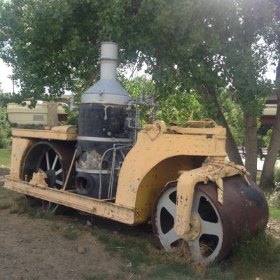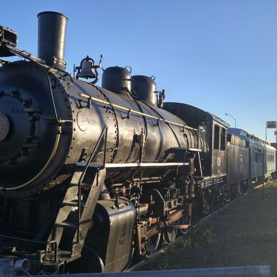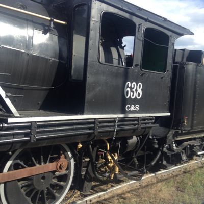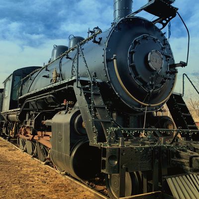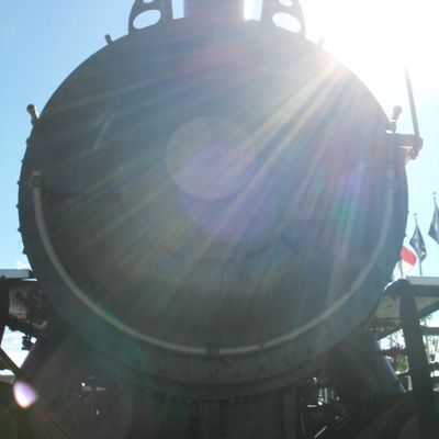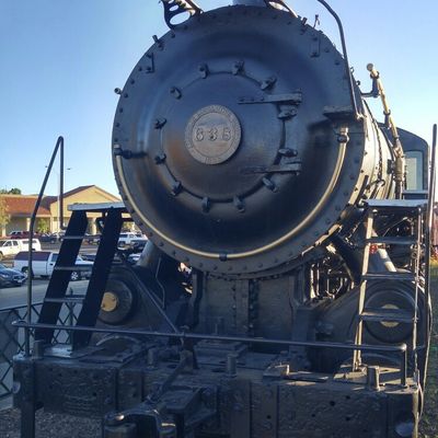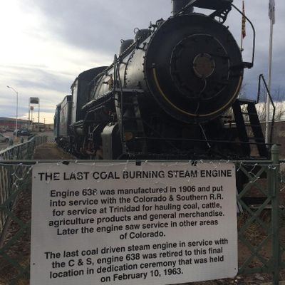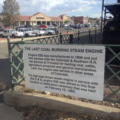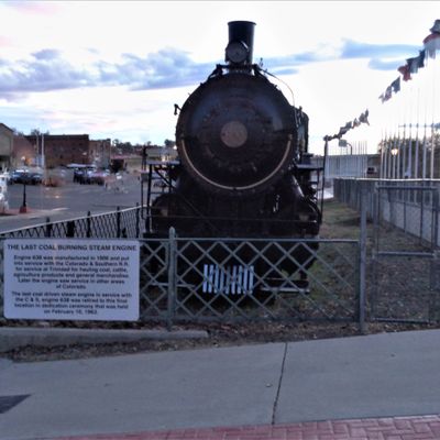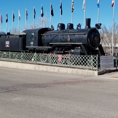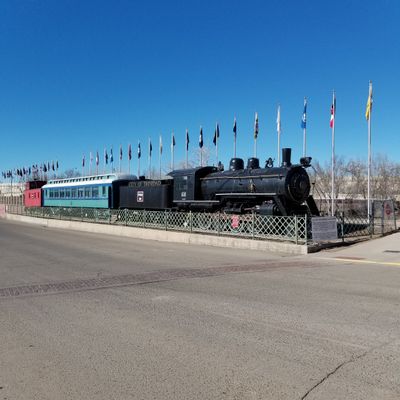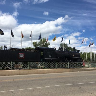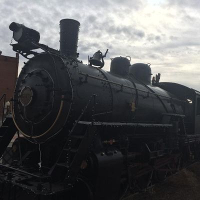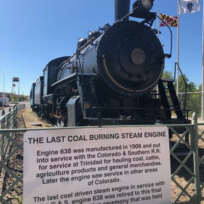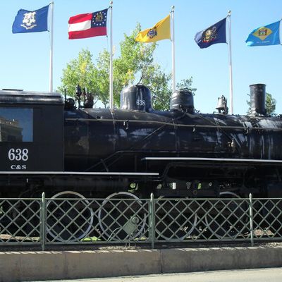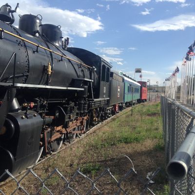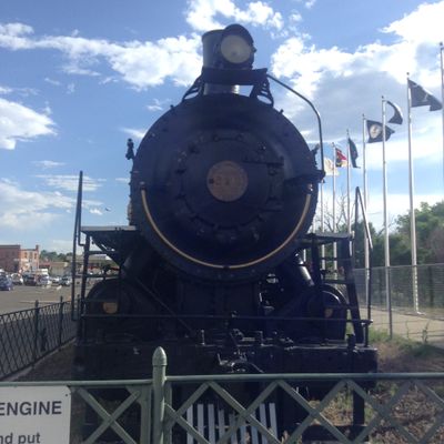 Preserved coal-driven steam locomotive, reportedly the last one of its kind in service. It is displayed as part of a small park alongside a collection of state flags.