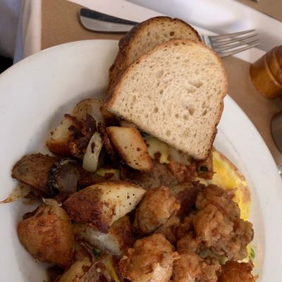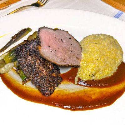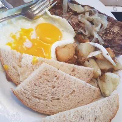 The menu features comfort-driven American fare, including shrimp and hearty portions of grits. The steak is a notable option for those seeking a classic, satisfying meal.food_potoo