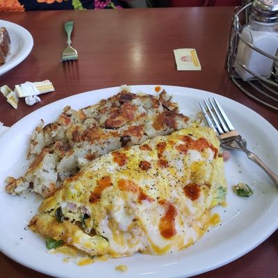Enjoy a hearty New Mexico omelette served alongside house fries, fresh tomato slices, and toasted sourdough. The French toast and skillet-style breakfast options are also standout choices to pair with a fresh cup of coffee.food_potoo