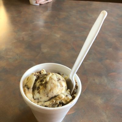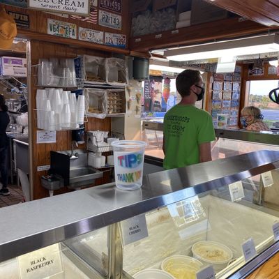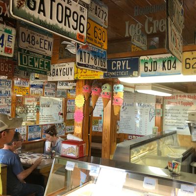 Popular ice cream shop with a drive-thru, offering homemade ice cream in many flavors, generous portions, and a charming, license-plate decorated storefront.