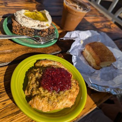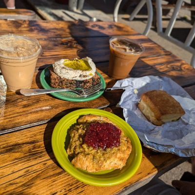 The breakfast sandwiches served on biscuits are a standout, alongside fresh cinnamon rolls and various pastries. The coffee is house-roasted to provide a high-quality pairing for the baked goods.food_potoo