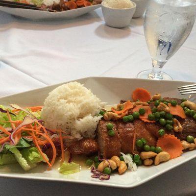 The Golden Triangle fried tofu with dipping sauce is a standout appetizer. For main courses, the Pad Thai flat noodles and the Pao Khing with refreshing young ginger are highly recommended.food_potoo