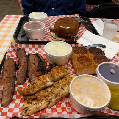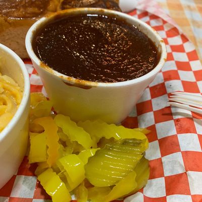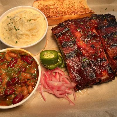 Order the three-meat dinner platter featuring brisket, hot links, and baby back ribs. The sides, particularly the mac n cheese, potato salad, and garlic bread rolls, pair perfectly with the smoky meats.food_potoo