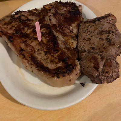 Rustic steakhouse known for its large portions, hand-battered onion rings, and excellent baked potatoes; cash or check only.