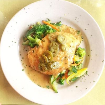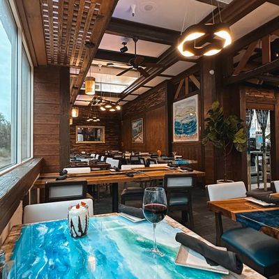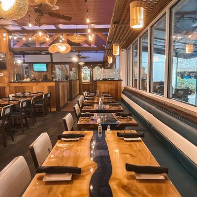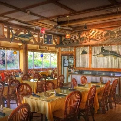 Resort restaurant with a lively atmosphere offering varied cuisine including seafood, steaks, and burgers, featuring live music and a full bar.