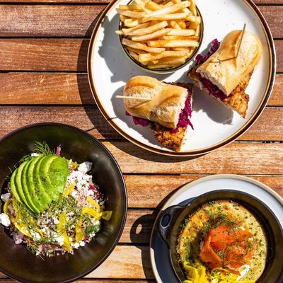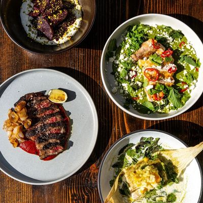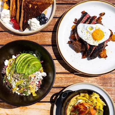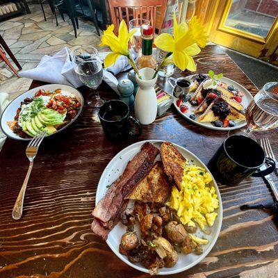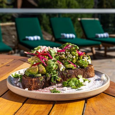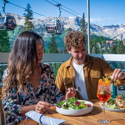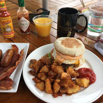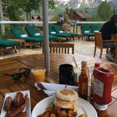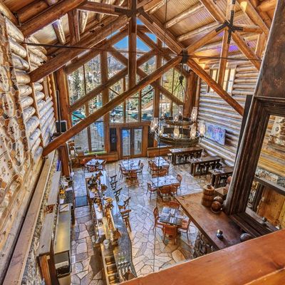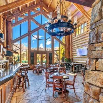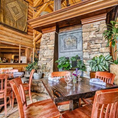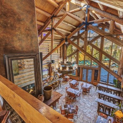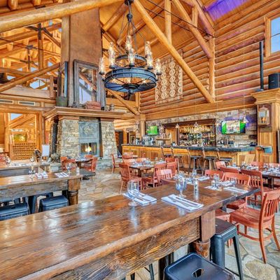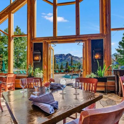 Mountain lodge restaurant with American and contemporary cuisine, offering stunning views, a full bar, and both indoor and outdoor seating.