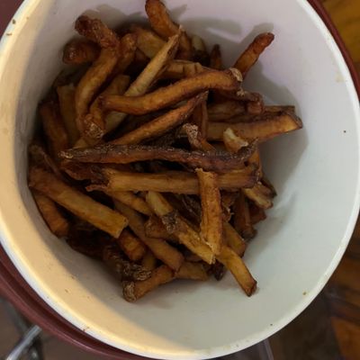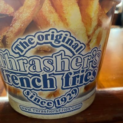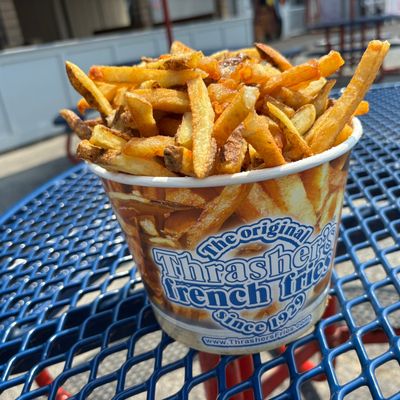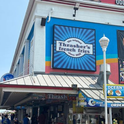 Boardwalk French fry chain, known for its salty, vinegar-drenched potatoes, offering both cups and buckets, a classic Ocean City experience.