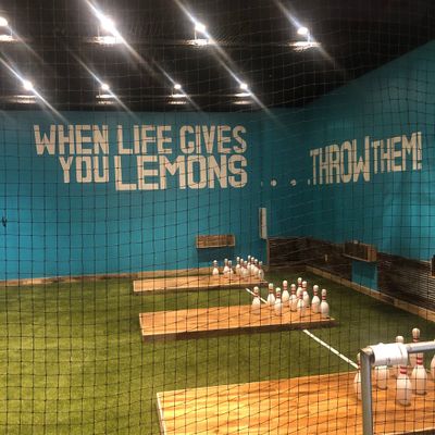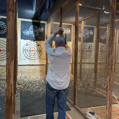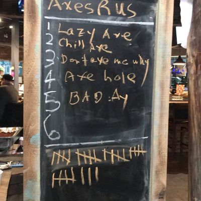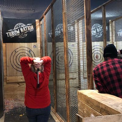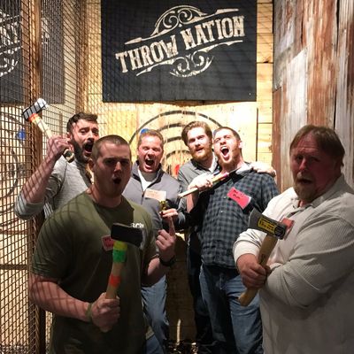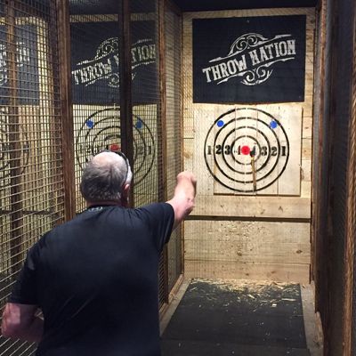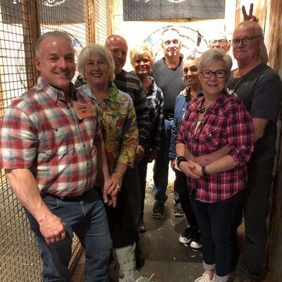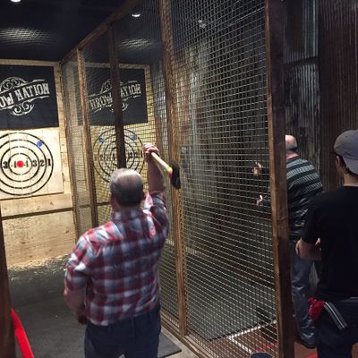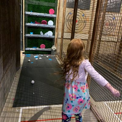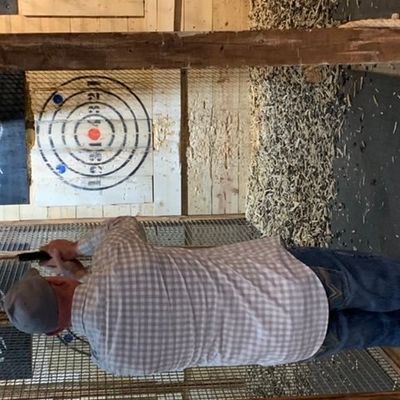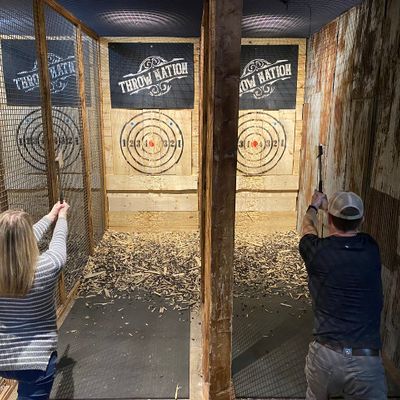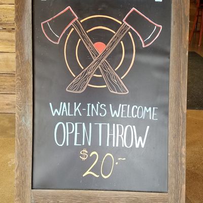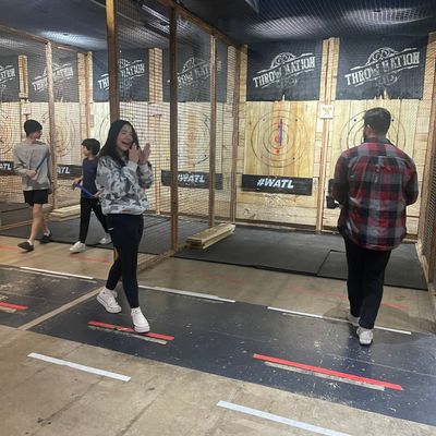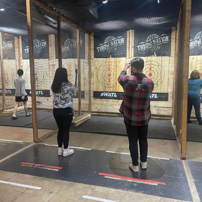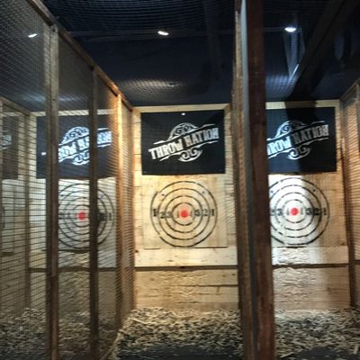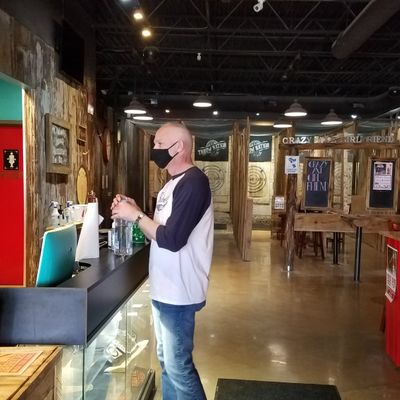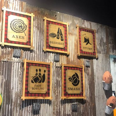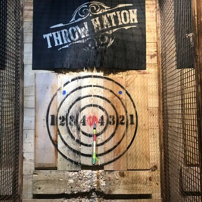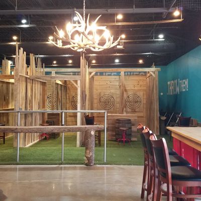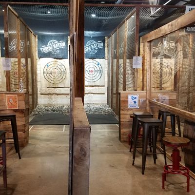 Indoor axe throwing facility offering a fun and engaging activity for individuals and groups. The establishment features a modern, rustic atmosphere with a stocked bar and additional entertainment like pinball machines.