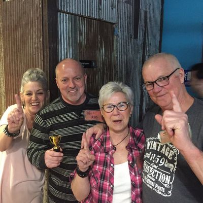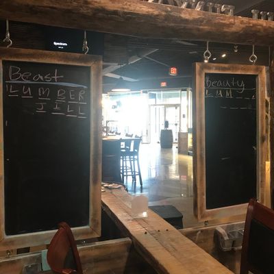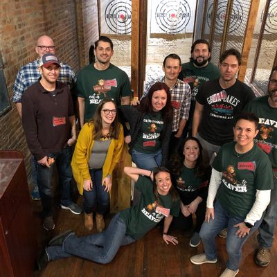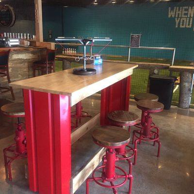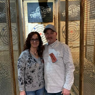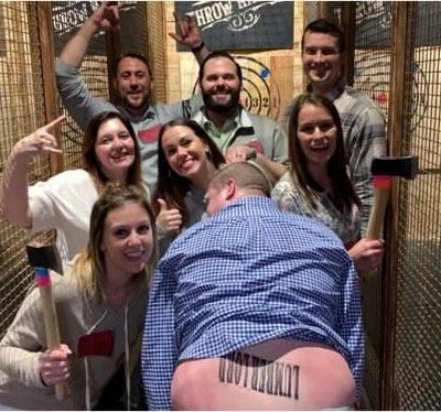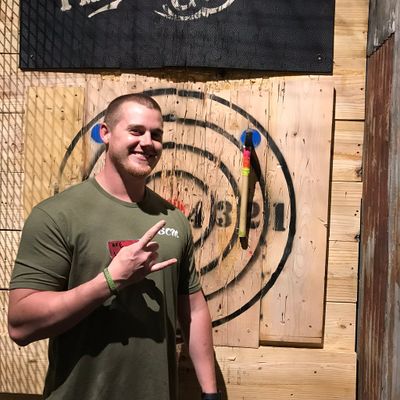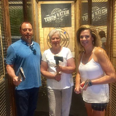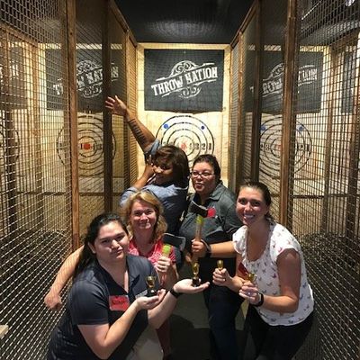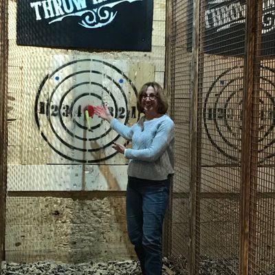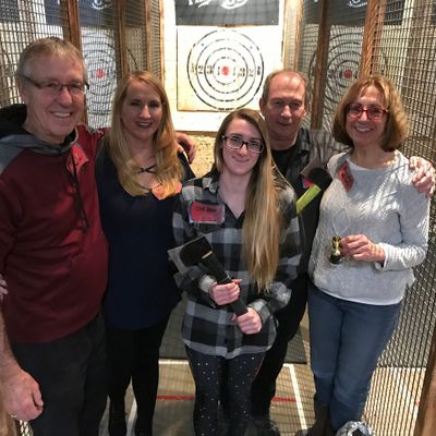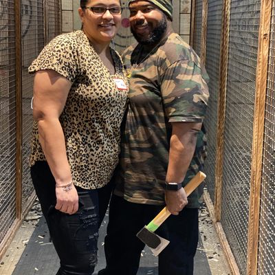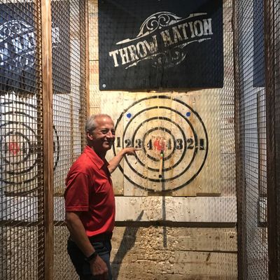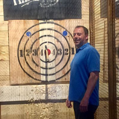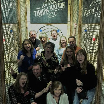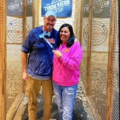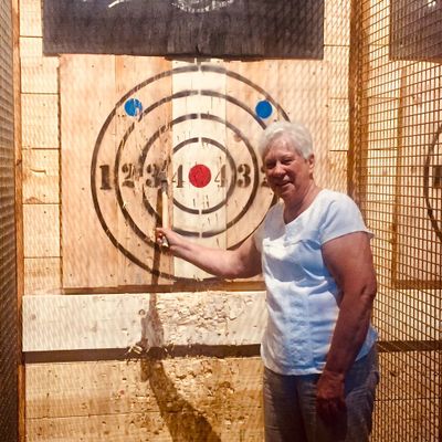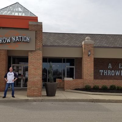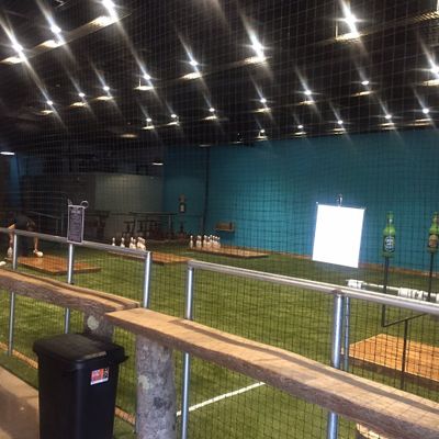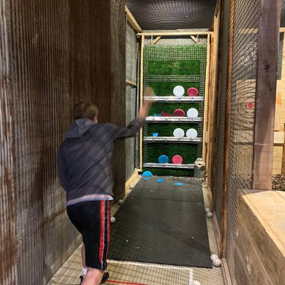 Indoor axe throwing facility offering a fun and engaging activity for individuals and groups. The establishment features a modern, rustic atmosphere with a stocked bar and additional entertainment like pinball machines.