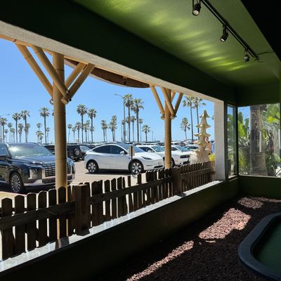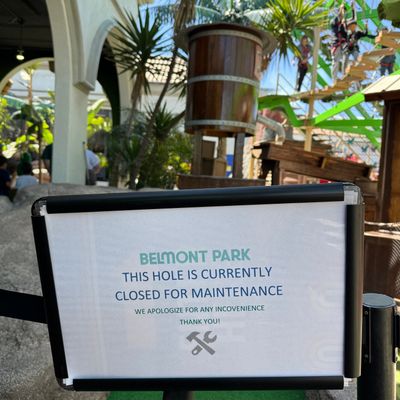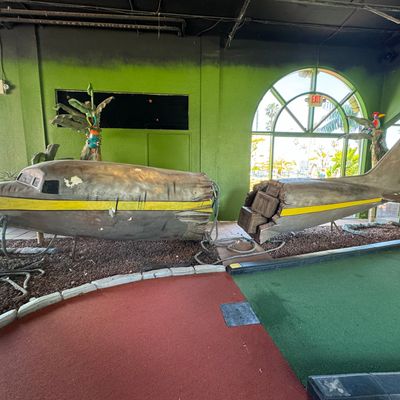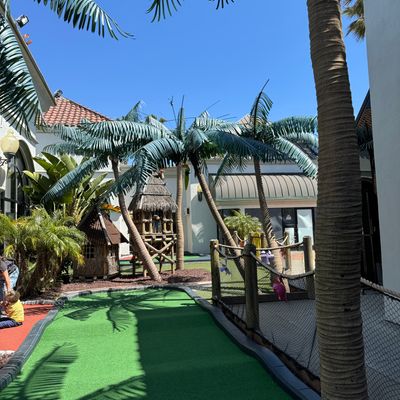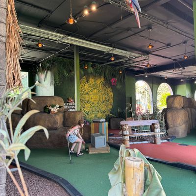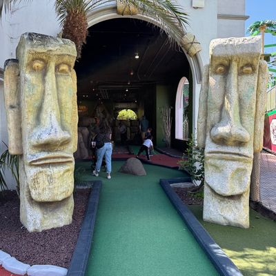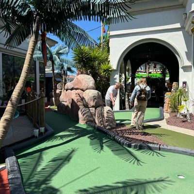 Compact miniature golf course located within Belmont Park. The course features a Tiki theme with decor and a mix of indoor and outdoor holes.