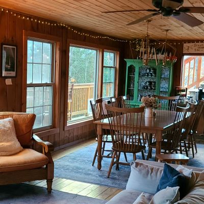 Charming and cozy historic ski lodge offering a warm, welcoming atmosphere. Guests can enjoy shared spaces like a living room and dining area, often with mountain views, and amenities such as a hot tub and firepit.