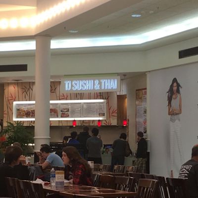 Mall food court Asian eatery offering sushi and hibachi, with some inconsistencies in food quality noted.