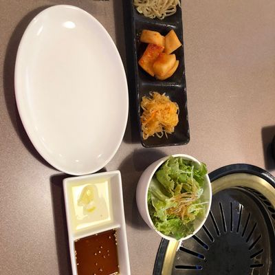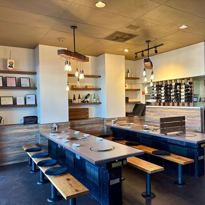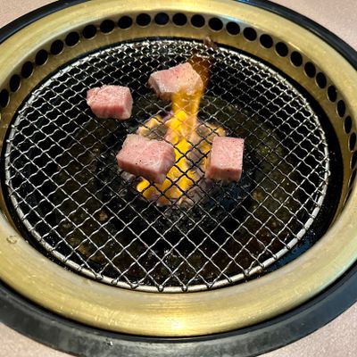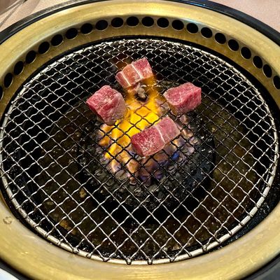 The air hums with the low murmur of conversation and the sizzle of yakiniku on tabletop grills, creating a lively, communal atmosphere. Warm, focused lighting illuminates each table, highlighting the shared experience of cooking and eating.