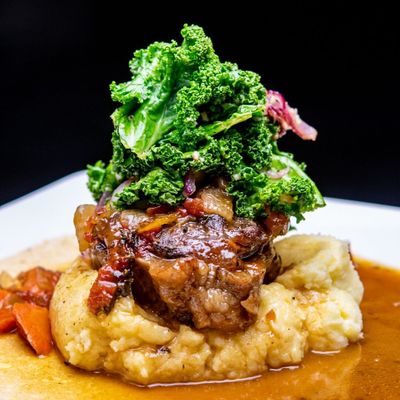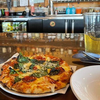 Mountain lodge-style restaurant with an upscale American menu featuring wood-fired pizza and creative dishes, located off the main road.