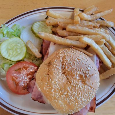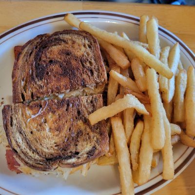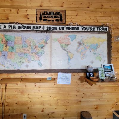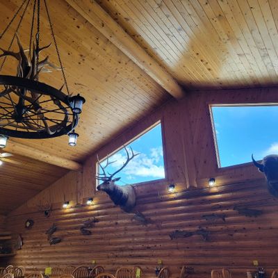 Rustic American restaurant in a log cabin setting, known for hearty breakfasts and large portions, featuring unique taxidermy decor.