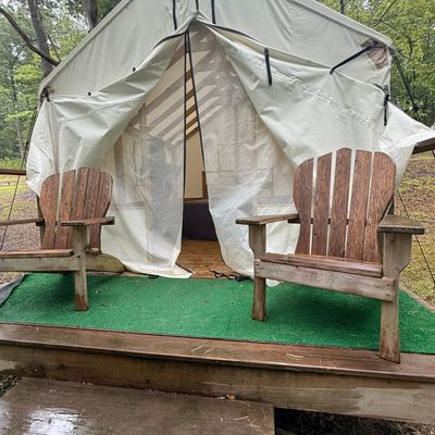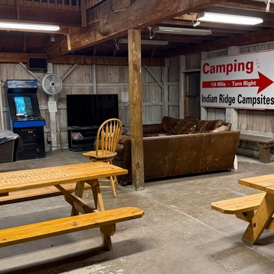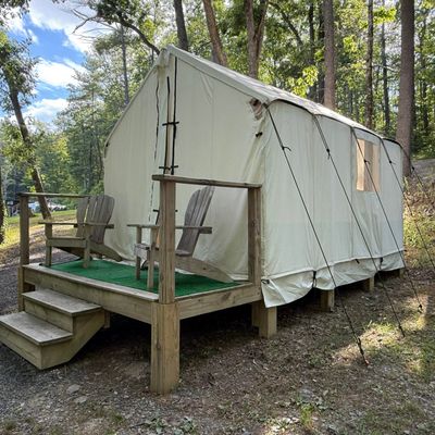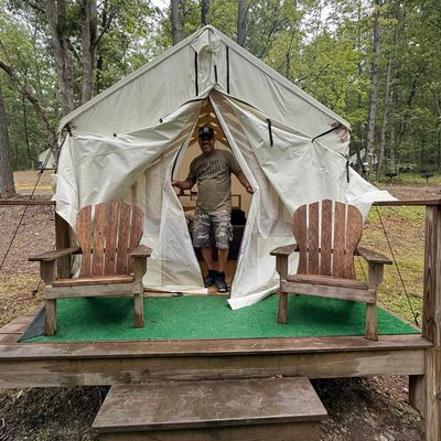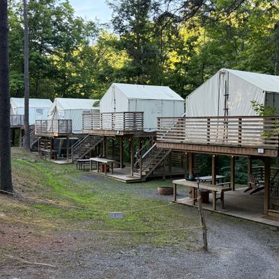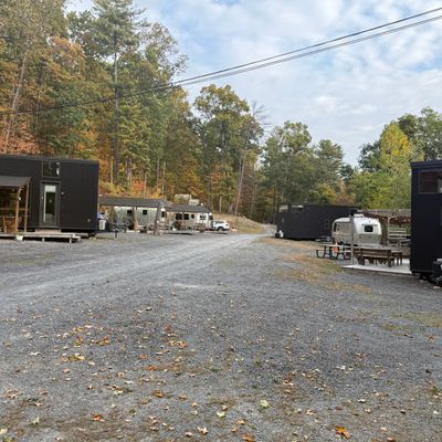 Treetopia Campground offers a variety of unique lodging options, including cabins, glamping tents, and A-frames, set within a scenic natural environment. The campground features amenities such as a swimming pool, arcade, and communal gathering spaces, making it a family-friendly destination.