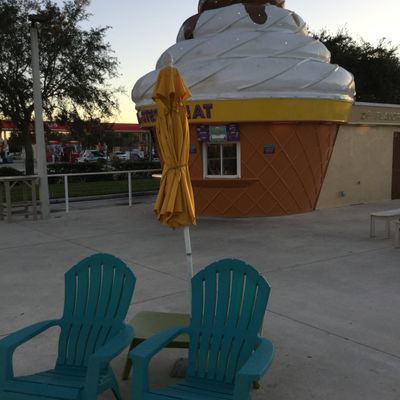 Whimsical fast-food ice cream parlor shaped like a giant cone, offering a wide variety of soft serve, shakes, and sundaes along with hot dogs.