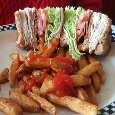 The menu features hearty fare like the turkey club and savory sausage-based biscuits and gravy. The crispy fries are a standout accompaniment to any meal.food_potoo