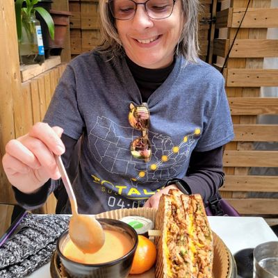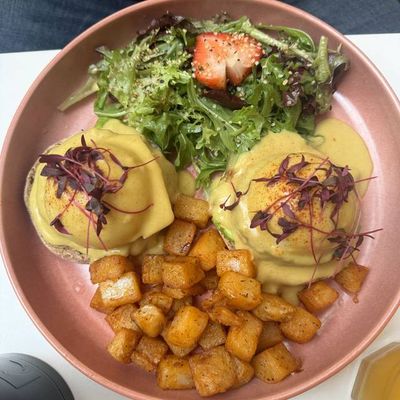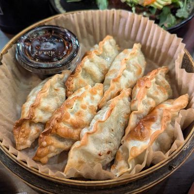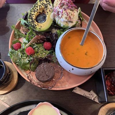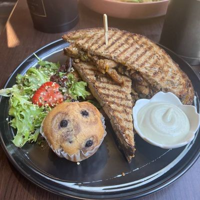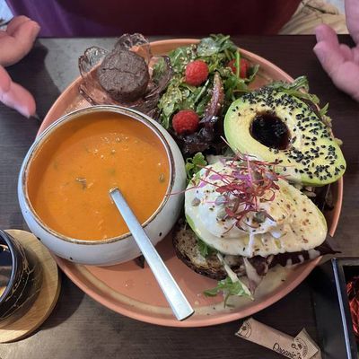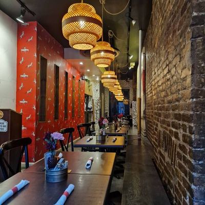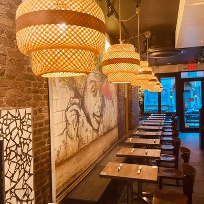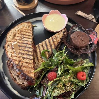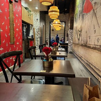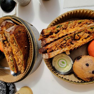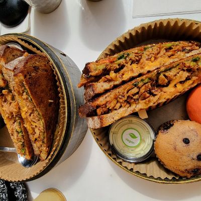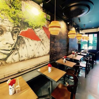 Fusion restaurant with a lovely indoor patio offering delicious sandwiches and other dishes, including vegan options.