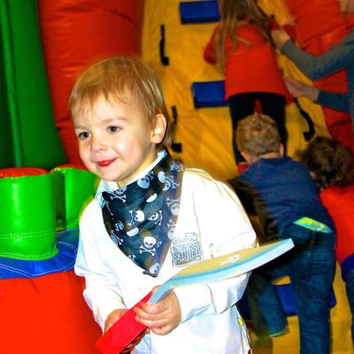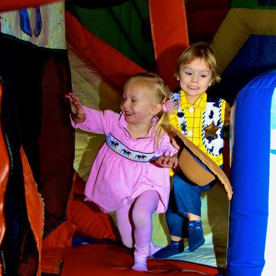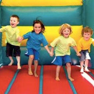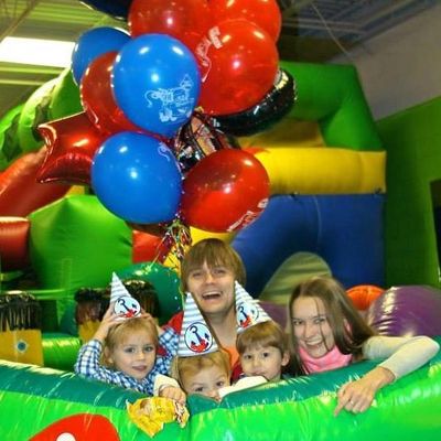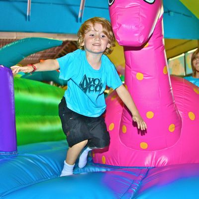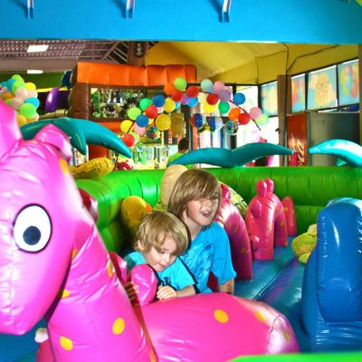 The atmosphere is energetic and kid-centric, centered around massive inflatable structures that invite constant movement. It serves as a high-energy destination for families looking to burn off energy indoors.ambiance_potoo