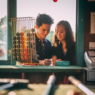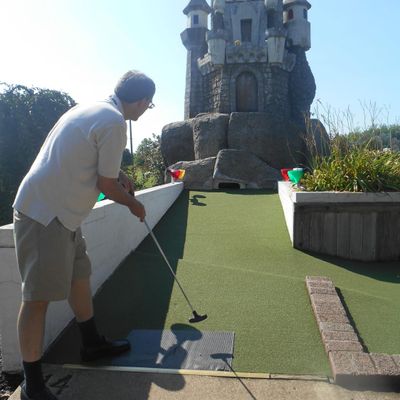 Waltz Golf Farm offers a variety of attractions including two themed miniature golf courses, batting cages, and a chip and putt area. It also features a driving range and a gem panning activity for children.