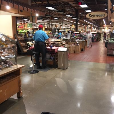 Large supermarket offering a wide variety of products and departments. It features extensive selections in produce, deli, cheese, and wine, along with a food court and bakery.