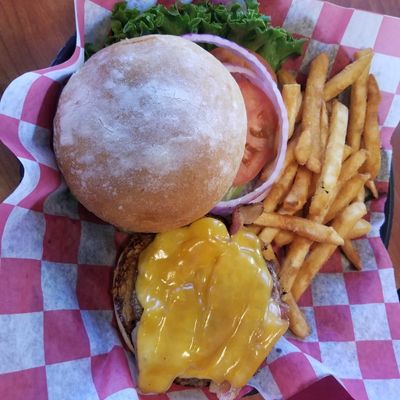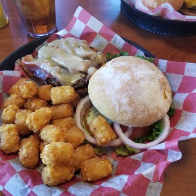 Casual American bar and grill near a golf course, offering burgers, prime rib, and salads in a relaxed atmosphere.